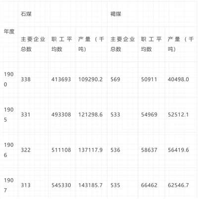 德国煤炭工业和整个矿冶工业的发展也显示了相同的结果。煤炭工业中主要企业的数量1871年至1875年平均为623个,1889年减少到406个,而同一时期产量却从34485400吨增长到67342200吨,平均每个企业的职工总数从172074人增加到239954人,下列表格显示了到1907年为止的石煤和褐煤开采业的集中过程。