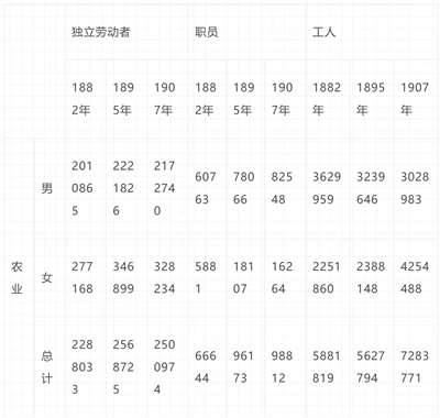 此表说明,农业部门独立劳动者的数量虽然从1882年到1895年增加了280692人,即增加了12.5%,但是从1895年到1907年又减少了67751人,结果与1882年相比独立劳动者的数量仅增加了212941人,即仅增加了9.2%。相反,农业工人的数量从1882年至1895年减少了254025人,即减少了4.3%,但是从1895年起却增长很快,增加了1655677人,即增加了29.4%。如果我们对这种增长作进一步的考察,就会发现,这种增长主要归因于作辅助劳动的女性家庭成员的增加(男性增加了170532人,女性增加了1820398人,共增加了1990930人)。仅就农村的临时工和雇工而言,结果是男性减少了381195人,女性增加了45942人,农业工人总共减少了335253人。在农业方面不仅独立劳动者有所减少,而且临时工和雇工也有所减少,农业部分与前一个统计数字相比有所增加,这是家庭辅助人员尤其是女性家庭辅助人员大量增加的结果。