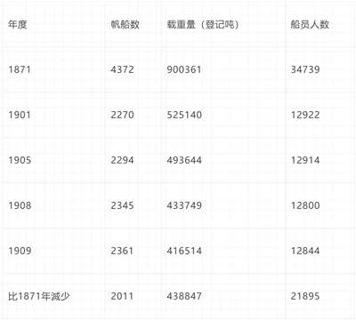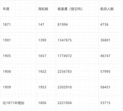 轮船不仅数量在增加,其载重量增加的幅度更大,相对而言,船员数量却减少了。1871年平均每艘轮船载重量为558登记吨,有船员32.1人,而1909年平均每艘轮船载重量为1230登记吨,只有29名船员。