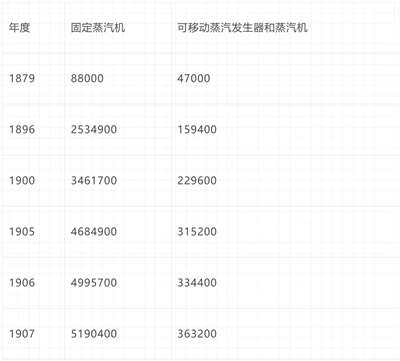 由此可见,1907年普鲁士所使用的马力数几乎是1879年的6倍!在普鲁士,固定蒸汽机的数量从1896年到1907年增加了35%,整个机器的效率在此期间甚至提高了105%,从这一点可以看出在1895年的统计之后工业发展取得了多么巨大的进步。1898年用于驱动发电机的蒸汽机共有3305台、258726马力,1907年增加到6191台、954945马力,即蒸汽机数增加了87%,马力数增加了269%。