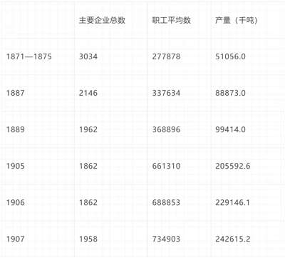 1871年有306个熔矿炉在运转,雇用工人23191人,生产生铁1563682吨,到了1907年则有熔矿炉303个,雇用工人45201人,生产生铁12875200吨,1871年每个熔矿炉的平均产量为5110吨,到了1907年便已达到42491吨!“根据1896年3月发表的‘钢铁’一览表,当时德国只有一个冶炼厂即奧伯豪森的好运冶炼厂能够在24小时之内生产生铁820吨。而到了1907年,能够在24小时之内生产1000吨以上生铁的冶炼厂就已有12个之多。”