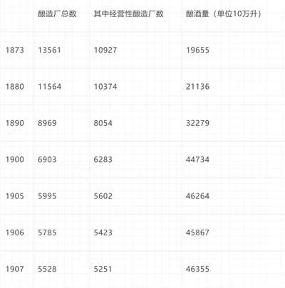 从1873年到1907年酿造厂总数减少了8033个,即减少了59.3%,经营性酿造厂的数量减少了5676个,即减少了51.9%,而啤洒产量却增加了26.7亿升,即增加了135.7%。这意味着中小企业的破产和大企业的规模扩充及其效率的成倍提高:1873年平均每个酿造厂生产145000升啤酒,1907年平均每个酿造厂生产838500升啤酒。所有资本主义占主导地位的地方的情况都是如此。在奧地利,1876年有2248个酿造厂,生产啤酒1167127800升,1904—1905年只剩下1285个酿造厂,却生产啤酒1909854000升。