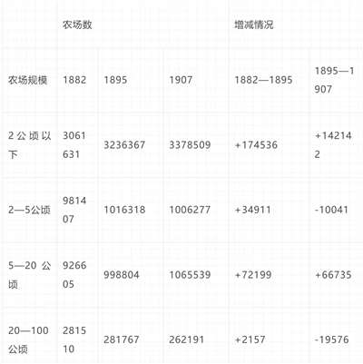 但是,农场统计与财产统计并不完全相同。例如,1895年大大小小的单纯的租佃农场至少有912959个,自己的土地和租佃的土地各占一部分的农场有1694251个,以作为实物津贴的土地、作为恩俸的土地以及乡镇土地的一个部分等等其他形式经营的农场有983917个。