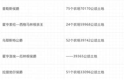 相反,也有一些个人拥有许多农场。德国最大的土地占有者是普鲁士国王,他有83个农场、98746公顷土地,在他之后依次为: