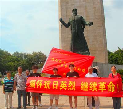 武汉人民抗战行的旗帜格外醒目,由安志琴任旗手,沿途许多朋友借我们的红旗照相留念,在前往铁道游击队纪念碑时,铁道游击队艺术团看到我们的旗帜,一见如故,与我们一起合唱微山湖、洪湖水浪打浪、弹起心爱的土琵笆等革命歌曲,银河同志赠送他们10枚毛主席像章,并合影互加微信。红旗就是就是标志,红旗就是方向,红旗就是力量。