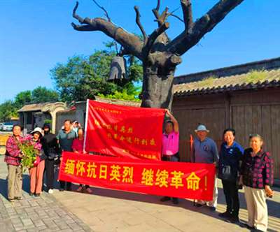 我们在抗日英烈战斗牺牲的冉庄大树下,举行缅怀抗日英烈仪式,由抗美援越功臣秦鑫安的夫人许国芹主持,银河献花刘文琴摄像。许国芹深沉的讲,“今天我们来到河北省冉庄地道战革命先烈曾经战斗牺牲的地方,缅怀先烈,将革命进行到底!革命烈士永垂不朽,全世界无产者联合起来,社会主义一定胜利!”
