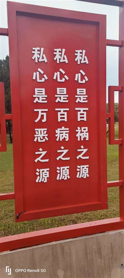 从南街村村口到东方红广场,要经过两个红绿灯。沿途尽是红色和绿色的景点,绿色是公园、是绿地,红色当然就是红色的标语,主要是毛主席语录,也有南街村人对毛主席的崇拜之语。真是目不瑕接。我择其要者而拍之,择其要者而读之,我偶尔也出出镜,用我那塑料普通话讲一讲。