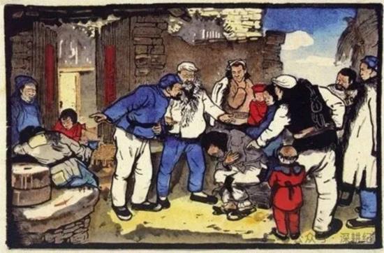 《二流子转变》原版为黑白木刻画,图为1947年套色木刻并重新命名的《改造二流子》
