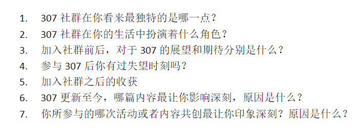 本期推文根据307社群内联活动【坦白局】内容选编整理而成,因为篇幅限制,将会分多次推送。之前已经推送过上半辑两篇,主要是运营团队回应其他社群朋友的针对提问,本篇为下半辑,主要为所有朋友围绕七个话题,分享自己加入307至今的心路历程,讲述他们心中的307。