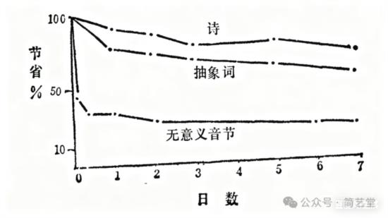 十九世纪末,德国心理学家艾宾浩斯对记忆和遗忘进行了长时间的研究。他以自己为实验对象,在七、八年间学习了几千个无意义音节字表,每个字表由10~36个字母组成,并记录遗忘产生的情况。1885年,他发表了研究结果,其中最主要的是有名的艾宾浩斯遗忘曲线(见下图)。图中横座标为熟记一组字表之后到检查时的时间间隔,纵座标为在该时间间隔上重学达到熟记与开始记住所花费的时间相比,重学所节省时间的百分数,它标志着记忆的保持率。例如一组无意义音节字表,从开始记忆到可以记住花10分钟,过20分钟后检查,开始遗忘,但重新记住只需4.2分钟,重学节省的时间为5.8分钟,为开始记住时间的58%,即重学节省时间百分数为58%。