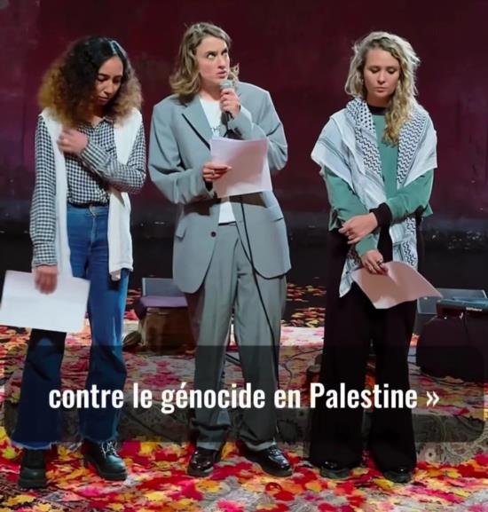 字幕:“反对在巴勒斯坦的种族灭绝”