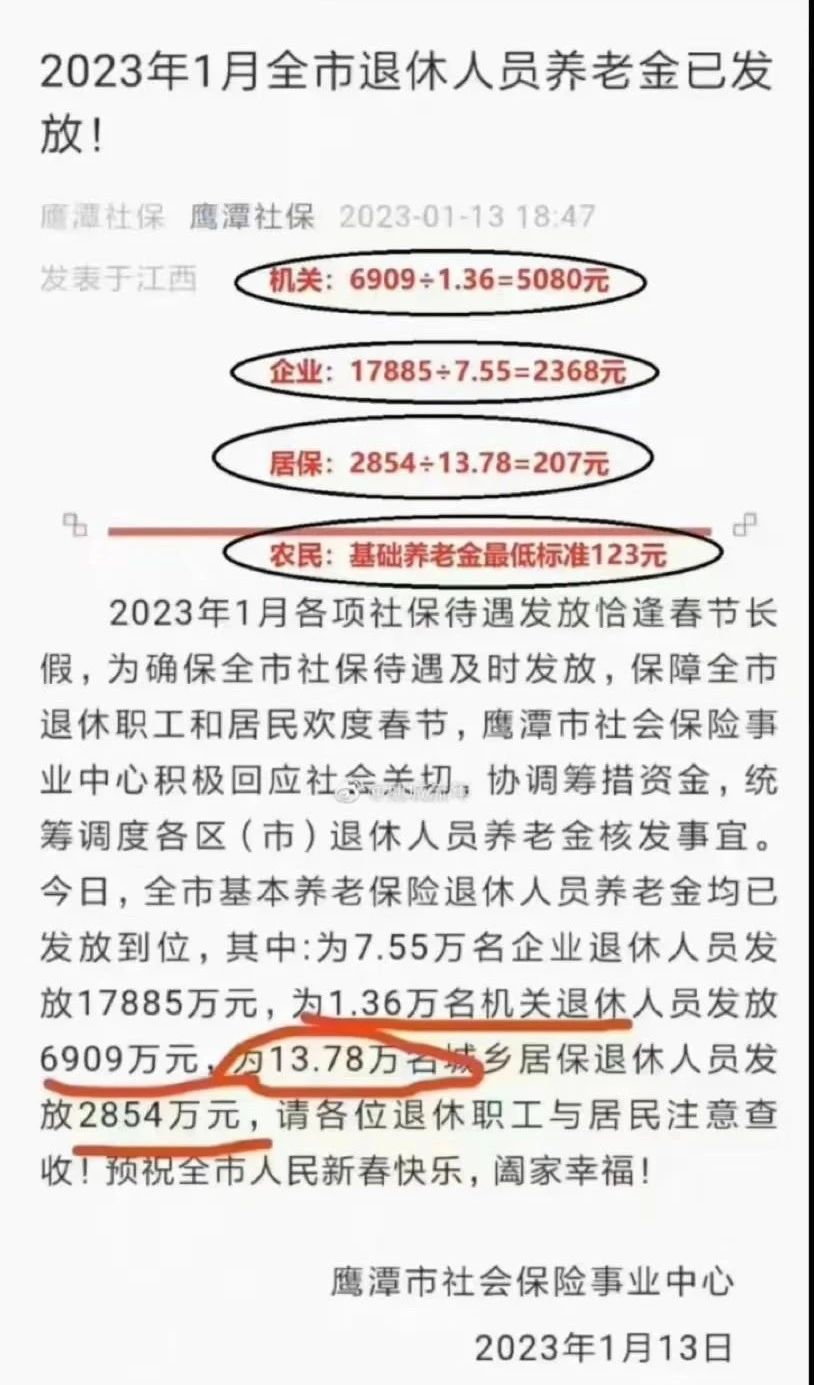 每年各级政府单位的社保收支总额情况,按照要求每年是要进行公示的。但其中的具体分配细节则很少看到。我们以之前流传的江西鹰潭于2023年春节前发布的当年1月全市退休人员养老金用发放情况的数据来测算下看看,相信对于全国绝大多数的地区、人口是有参考意义的。