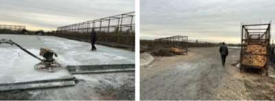 ?(上)陈叔在他宽敞的、新浇了水泥的晾晒场里。(下)晾晒场里的钢管玉米架子。摄:裴丹