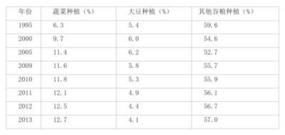 表1:中国新旧农业播种面积占全国播种面积的百分比丨资料来源:不同农作物百分比的数据来自《中国农村统计年鉴1996–2014》和《中国统计年鉴2001–2014》(国家统计局1996–2014:表6–3,表7–3;2010–2014:表7–3)。