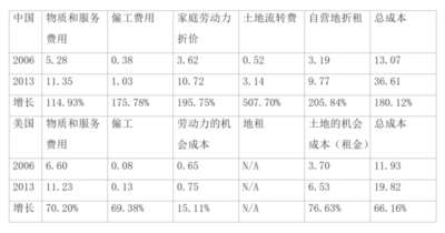 从2006年到2013年,比较美国和中国的大豆生产成本发现,两国的各项生产成本都增加,但中国的增加幅度比美国更大(表2)。2006~2013年,中美两国大豆生产成本中,物质和服务费用的比例都是最高的,中国大约为40%,美国大约是55%–60%。从2006年到2013年,中国的该项成本增加了115%,而美国只增加了70%。劳力和土地的机会成本——中国大豆生产成本中次高的两项成本——各占总成本的大约23%–30%,在这几年中增幅分别达到196%和206%。在中国大豆的所有成本中,土地租金的增长最为显著[7]。