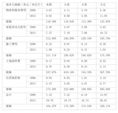 在中国,大豆并非是唯一生产成本飙升的农作物。如表3所示,从2006到2013年,三大主粮——水稻、小麦和玉米——的各项生产成本也都增加了,包括物质和服务费用、家庭劳动力折价、雇工费用、土地流转费和自营地折租。从各项成本的对比来看,大豆生产的物质和服务费用的涨幅最大。大豆的总生产成本涨幅高达180%,是为最高,三大主粮各自的总生产成本涨幅也紧随其后。