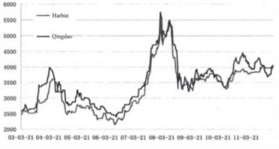 一位大豆产业的业内人注意到了大豆的自由化并在访谈中告诉我们:大豆的国内市场已经是国际市场的一部份[5]。的确,图5显示了中国本土大豆在2003到2011年间的价格并非独立于进口大豆的价格,而是与进口大豆的价格走势高度一致。
