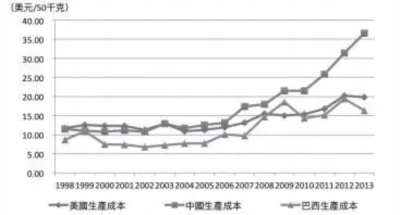 黄宗智和高原认为,使用草甘膦除草剂使美国大豆变得成本低廉因而更具竞争力,并以此经济逻辑来解释转基因大豆的大量进口,使之合理化。我们对美国、巴西和中国大豆生产成本之间的比较确实显示,以每50公斤大豆的生产成本来看,巴西大豆的成本最低,中国的成本最高。直到2003年,中国大豆的生产成本都和美国大致相同。中国大豆的生产成本在2006年开始提高,并在2009年之后以远高出美国和巴西的速度增加(图6)。这表明,理解生产成本差异的关键不在于美国或巴西,而在于中国的大豆种植究竟出了什么状况。由于美国自1990年代开始种植转基因大豆起,就采用了草甘膦除草剂,这个常量因素并不能解释中美两国大豆生产成本自2009年以来出现的差异。