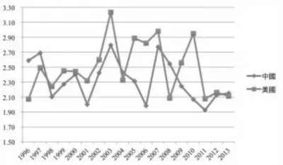 图3:中国和美国大豆与玉米的价格比率(1996-2013)丨资料来源:中国玉米价格数据来自中国国家发展与改革委员会之《全国农产品成本收益资料汇编》(2008:表1–8–1;2014:表1–8–1),中国大豆价格数据来自中国国家发展与改革委员会之《全国农产品成本收益资料汇编》(2008:表1–9–1;2014:表1–9–1)。美国的大豆和玉米价格来自美国农业部(United States Department of Agriculture 2006, 2013)的官方网站。