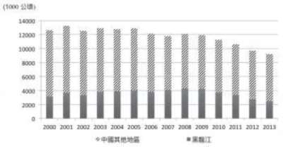 图1:中国大豆播种面积(2000-2013)丨图片来源:《中国统计年鉴》(国家统计局2001–2014:表12–14,13–15,12–13,13–13,12–8)