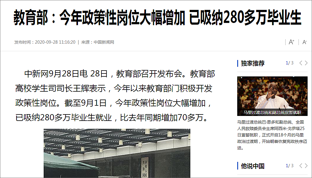 我理解的政策性岗位,也就是吃皇粮的岗位。因为全球疫情影响,今年比去年多出70余万吃皇粮的人。读到此处,不禁想到,280万人算是解决了就业,那么今年毕业的其他人如何了呢?毕竟不可能每个毕业生都有那么幸运,都能够吃上皇粮。