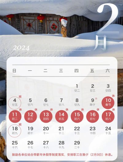 在2024春节的放假安排里,有一行“暖心”提示:“鼓励各单位结合带薪年休假等制度落实,安排职工在除夕(2月9日)休息。”其实即便没有这条提示,按照2014年这样的调休调不过来的年份惯例,很多单位和公司在除夕这一天,如果没什么事也就给员工放假了,顶多上半天班,此举还能彰显老板对于员工的“体恤”,甚至让员工对老板感恩。