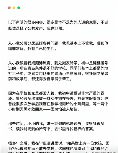 蒋小姐在她的回应文章中说:她初中是随机摇号进的一所在青岛条件很不好的学校,同学们基本上都是外地打工子弟,或者菜市场里的普通小生意家庭。很多同学早课前和放学后,都还得去自家铺子帮工。因为在学校和家里都没人管,其初中遭受过非常严重的霸凌。曾经很多次她被一群女生摁在野外,扒光衣服羞辱;还曾经很多次放学后缩在教学楼厕所的小隔间里,等一两个小时到天黑才敢回家,因为怕被人堵住。