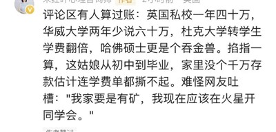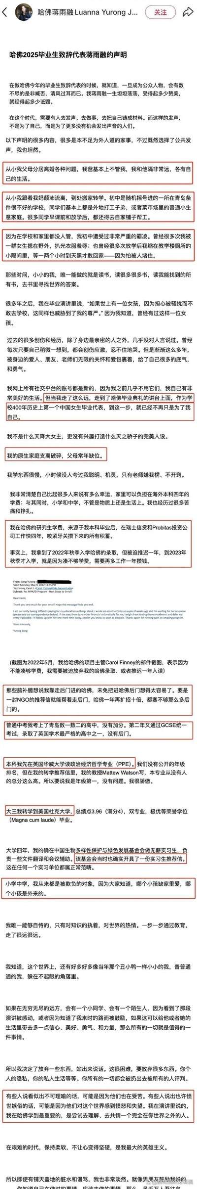 蒋雨融拥有这些资源无可厚非,在哈佛出彩也值得肯定,但非要把自己打造成“普通家庭”的励志典范,就有些刺痛了大多数小镇做题家。不是他们不努力,而是他们缺少像她那样的资源。国内学生通过高考进入顶尖大学的路径残酷,蒋雨融躲开了激烈的高考竞争,出国镀金,吃了肉再吧唧嘴,是对小镇做题家的讽刺。