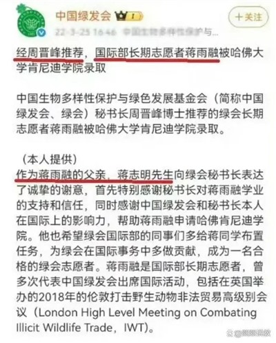 而“绿发会”的官方账号却公开宣称:经周晋峰推荐,国际部长期志愿者蒋雨融被哈佛大学肯尼迪学院录取。