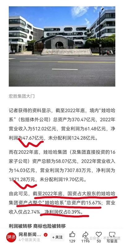 “截至2022年底,国资占大股东的娃哈哈集团资产占整个“娃哈哈系”总资产的15.67%;营业收入仅占2.74%,净利润仅占0.39%。”