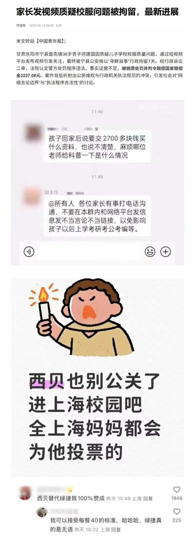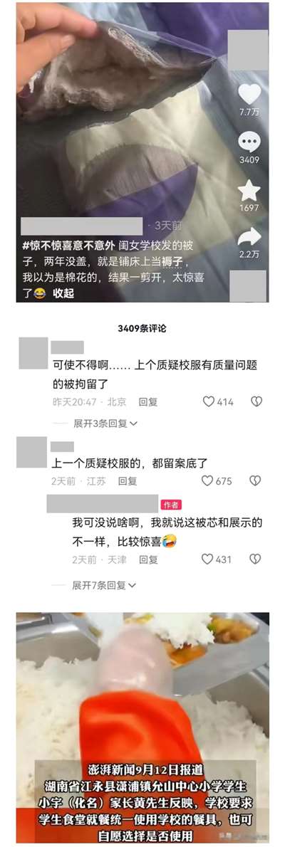 更幽默的是,前两天刷抖音看到一个家长发视频展示孩子所在学校发的黑心棉被子,下面有多条评论提醒她,之前质疑校服质量的人已经被拘了,让她小心,谨言慎行。