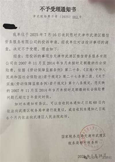 天津打工人老谢,于2025年7月16日到天津国税局某税务所请求追缴天津市某劳务公司自2007年11月至2014年9月未按时足额缴纳社会保险费,某税务所于7月18日出具《不予受理通知书》,不予受理的理由:“依据《劳动保障监察条例》第二十条、《实施〈中华人民共和国社会保险法〉若干规定》第二十七条第二款、《关于实施〈劳动保障监察条例〉若干规定》第十八条规定,您反映的2007年11月至2014年9月未按时足额缴纳社会保险费问题已超过2年查处时效。”