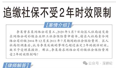 也有为打工人说话的部门。《天津工人报》2021年8月11日第三版“法律维权”栏目,以“律师解答”的方式明确“追缴社保不受2 年时效限制”。