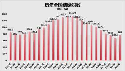 结婚登记对数十年间下降52.5%,从2013年的1346.9万对结婚登记开始,这一数字就逐年递减,而且是一年下一个阶梯。