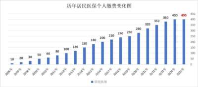 比较特别的地方在于,居民医保费用已连续上涨20年——从2006年的每人每年10元,涨至2024年的400元,涨幅达40倍。
