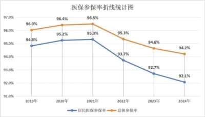 统计如上图所示,从2022年开始,医保参保率已经是三连跌了。