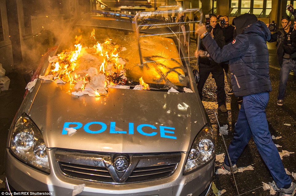 抗议人士朝警方丢烟火和玻璃瓶,部分被砸中的警察从马上掉下来,数名见血的抗议民众已接受治疗,当局也试图控制游行的局面。