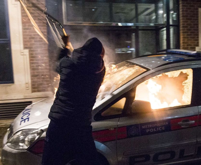 有些抗议民众跑去牛津街周遭伦敦主要的购物区砸已关门的商家窗户,还与警方发生扭打。