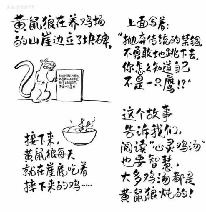 我们在成长的过程中无疑会遇到很多困难,有时候鸡汤的确能起到慰藉效果,并且帮助我们渡过难关,但随着我们日渐成熟,尤其是从大学校园进入工作场所(所谓的“社会”)之后,现实便会将鸡汤的治愈效果击得粉碎,我们也不得不接受自己的幼稚可笑。