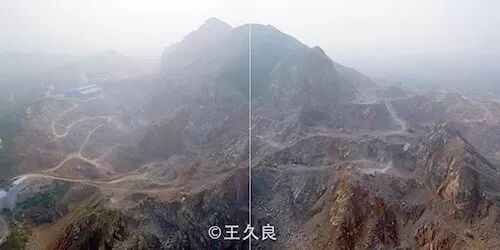 现在我们看到的这两个山头,其实就是刚才那个石材加工厂的石头来源地。经过N年的开采,整座山已经像一个马蜂窝一样。