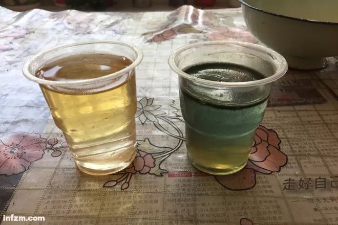 一杯经过自家净水器净化过的井水,一杯从7米深的地下抽上来的井水,插入电解棒数秒之后,净化过的水依然澄澈,直接抽上来的水变成绿色,水面上浮着墨绿色的渣滓。
