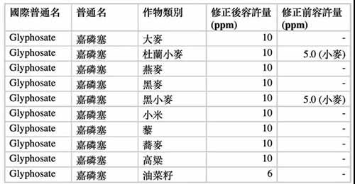 2019年4月23日,台湾食药署预告修改农药残留容许量标准,小麦、燕麦、大麦、黑麦和油菜籽等10项杂粮都在增订之列(见图1)。2项小麦标准放宽,其他谷物则是由不得检出改为容许10 ppm:除小麦部分新增杜兰小麦和黑小麦两项,标准从5 ppm放宽到10 ppm(其他小麦维持5 ppm),其余品项都是从不得检出改为10 ppm。过去草甘膦只有在大豆这一项的容许量是最⾼值10 ppm。