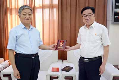 9月23日上午,河南省委组织部副部长、省公务员局局长郭成全一行,到临颍县南街村慰问“全国优秀党务工作者”、南街村党委书记王宏斌,并代为颁发由中共中央、国务院、中央军委联合授予的“庆祝中华人民共和国成立70周年纪念章”。
