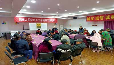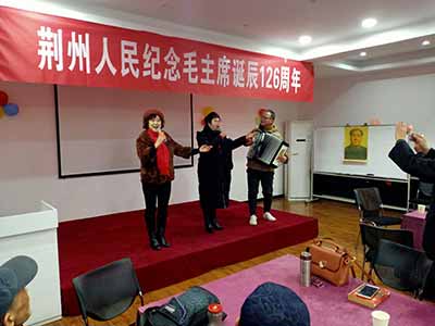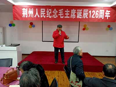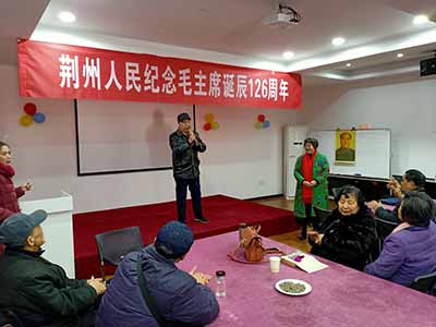 12月22日早晨8点半,人们从四面八方赶到约定会场,参加毛主席诞辰126周年纪念活动。与会者首先向毛主席像三鞠躬,合唱东方红。接下来几位同志热情讴歌人民领袖毛主席的丰功伟绩。 然后开始红歌演唱会,一支支深情的颂歌荡漾在会场,感染着每一个人。最后用吃长寿面的形式为毛主席庆生,表达了荆州人民对毛主席深深的感恩之情。