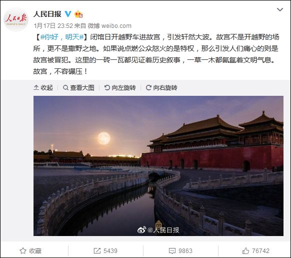 针对“女子闭馆日开奔驰进故宫”一事,@人民日报 1月18日称,闭馆日开越野车进故宫,引发轩然大波。故宫不是开越野的场所,更不是撒野之地。如果说点燃公众怒火的是特权,那么引发人们痛心的则是故宫被冒犯。这里的一砖一瓦都见证着历史叙事,一草一木都氤氲着文明气息。故宫,不容碾压!