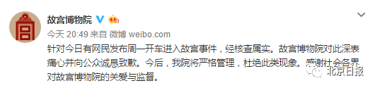 1月17日20时51分,故宫博物院官微发布消息:针对周一开车进入故宫事件,经核查属实。故宫博物院对此深表痛心并向公众诚恳致歉。