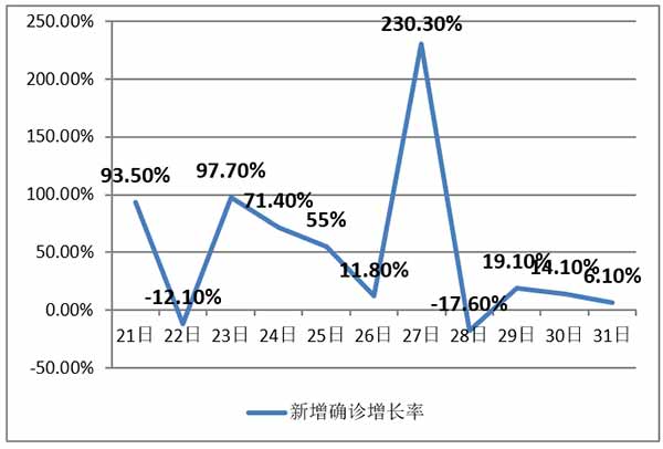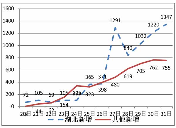 湖北省新增确诊病例虽然还处在上升阶段,但开始耷拉头了。29、30、31日这三天,湖北新增确诊环比增长为22.9%、18.2%和10.4%。。这个数值大致相当于湖北外省区27、28、29日数据,也就是趋势与其他地区相同逐渐转好,但慢了两天。这一方面说明湖北防疫还是很有效的,另一方面说明一两天后全国情况会更好。