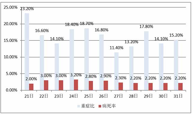 最后一张图是治疗情况。重病比略有上升,但属于正常起伏,依旧低于这11天16%的平均值。病死率连续4天为2.2%。
