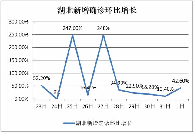 从公告数字看,湖北省在28日前数据波动幅度很大,这里有统计问题,也有检疫能力方面问题。但28后新增确诊环比增长数一直呈下降趋势,从35%逐日下降到31日的10.4%,但昨天突然猛增到42.6%,使本来已经耷拉的新增病例曲线又翘起头来。究竟发生了什么贫道不清楚,如果不是统计问题,说湖北防疫形势没有好转,或者说疫情尚未得到有效控制是没错的。由于得不到武汉疫情数据,不能做更细的分析。