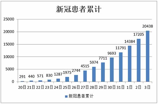 在连续3天每天新增2000多后,昨天新增确诊达到3235人。累计新冠患者已经突破2万,达到20438人。新冠从元月十几号开始流行,累计患者20日接近300,24日突破1000,31日突破1万,2月3日突破2万,按目前发展速度,2月6日会突破3万。如果按一些专家预计的阴历15(2月8日)新增确诊会达到顶点,届时累计患者会在4-5万之间。在新增病例小于治愈病例前,新冠患者就医数量可能超过6万,医疗物资和医护人员的准备不能低于这个数量。